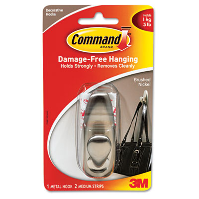 Command™ Adhesive Mount Metal Hook, Medium, Brushed Nickel Finish