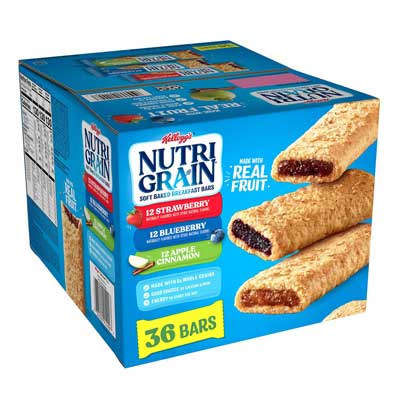 Kellogg's® Nutri Grain Bars Variety Pack (1.3 oz. bar, 36 ct.) provides 12 each of the Apple Cinnamon, Blueberry and Strawberry flavors for a quick morning meal or mid-day snack. Enjoy a delicious Nutri Grain bar with eight grams of whole grains, real fruit and no high fructose corn syrup. Each bar is made without artificial colors. The convenient packaging makes these bars perfect to store in a bag, backpack, lunch bag or office desk drawer.