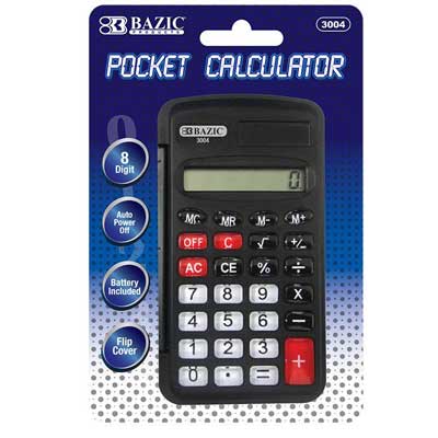 Be sure to always carry with you a handy calculator for all of your daily computing tasks! 8-Digit Pocket Size Calculator w/ Flip Cover. This calculator takes up little space in your backpack and fits easily into your pocket or bag. Compact size calculator is perfect for your pocket and briefcase. 8-Digit display. Square root keys. Full function memory. Constants for addition, substraction, multiplication & division. Try other great BAZIC Products. We offer a wide range of stationery products for all your school and office needs.