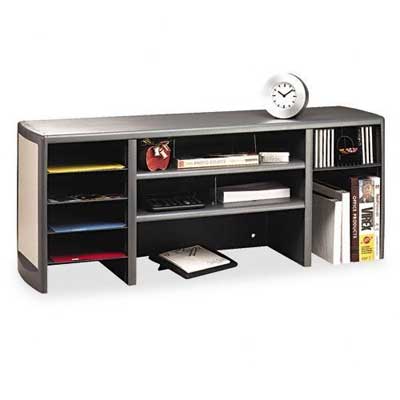 The durable steel space saver can use binders, folder office supplies, and other features. But make sure it's a pencil cup and CD storage. Adjustable steel shelves and plastic dividers. Can be an end panel and is covered with a fabric that pops out easily (not included in the product) Ideal for the office to meet your needs! 12 1/2 There is a deep shelf. 18 1/2 high. Desktop Classification Rack / Space Saver Type: hutch-style Space saving. Color (S): GRAPHITE; Gold; Material (S): Steel; Width: 47 inches.