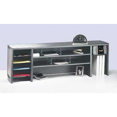 Solid steel construction with high impact plastic end caps. Includes decorative steel inserts, pencil cup and CD storage. Has bountiful room for binder storage.