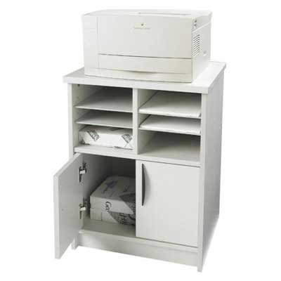 Modular machine stand is ideal for fax machines, small copiers and printers. Large storage area behind double doors and six open compartments provide ample organization area for your supplies. Printer platform measures 20-3/4" wide x 1-3/4" deep x 17-1/2" long. Machine stand features durable laminate with 2mm edging and a 300 lb. capacity.