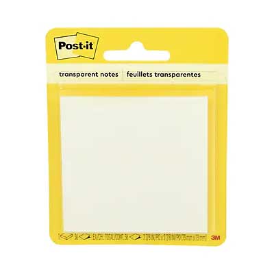 Post-it® Transparent Notes are transparent notes for use in books, crafts or other projects where you need to make notes on items and see underneath easily. The standard 2-7/8 in. x 2-7/8 in. size is great for making notes in textbooks, as you can see through to highlight or call out specific content. Use for crafts to trace images or patterns from other items.